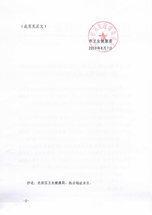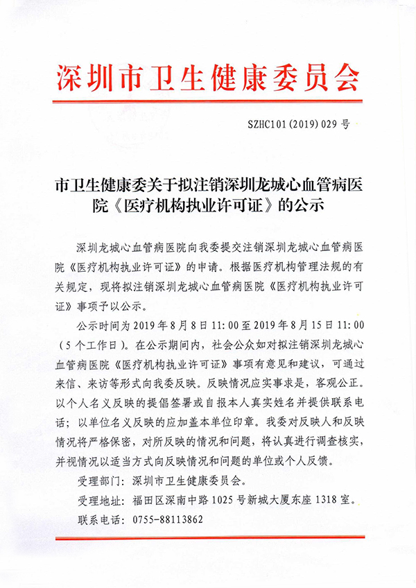市卫生健康委关于拟注销深圳龙城心血管病医院《医疗机构执业许可证》的公示