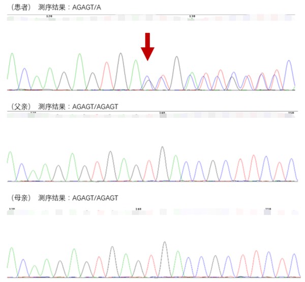本例患者家庭因主诉特殊面容和听力损失来健研中心实验室进行遗传病基因检测。经由中心实验室自主研发的TCS综合征检测方案的检测分析,发现其致病基因上的一处内含子突变(因文章尚未发表,此处隐去基因名与变异名)。经过家系验证,该突变为先证者自发突变,其父母均未携带有该风险因子。同时,该突变处于基因外显子与内含子邻接的位置,且在进化中相当保守,有较大可能为内含子剪接的位点(Donor site)。综合以上证据,结合ACMG国际标准,判定该突变有较大可能为该先证者的致病突变。