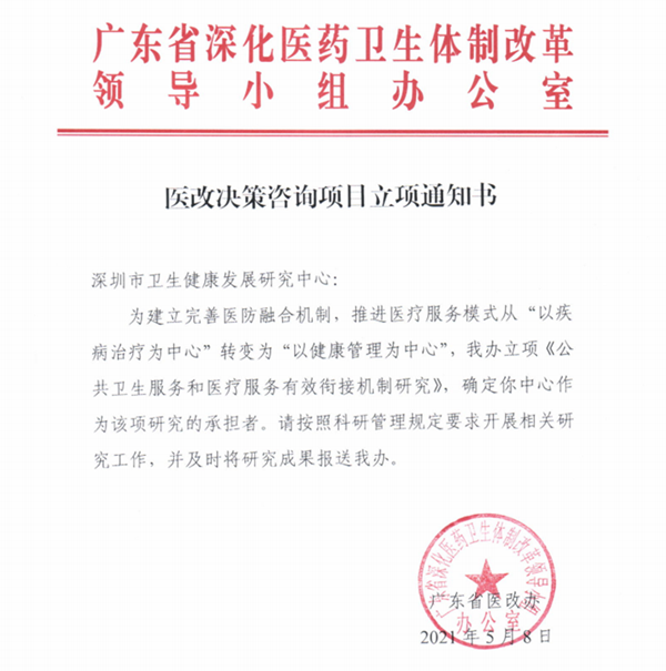 该项目通过厘清公共卫生服务与医疗服务衔接融合机制的定义特征、剖析广东省公共卫生服务与医疗服务衔接机制建设现状,提出广东省构建公共卫生服务与医疗服务衔接机制的可行性路径和配套保障措施。后期,我中心将认真部署,深入研究,联合本领域全国知名专家学者,为课题研究质量提供保障,争取获得科研成果和社会效益的双丰收。