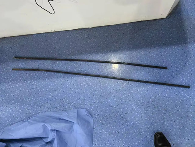 每根钢筋都有一米多长,一根穿透右上臂,一根穿透右侧颌面部,并可能伤及颅底!