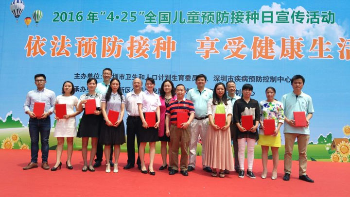 4月25日,深圳市围绕今年“依法预防接种 享受健康生活”主题,在龙华新区大浪商业中心正式启动全市大型“4.25儿童预防接种宣传日”活动。市卫生计生委副巡视员谢若斯,委公卫处张英姬处长,市疾病预防控制中心、龙华新区公共事业局、龙华新区疾病预防控制中心及各区疾病预防控制中心相关人员及全市最美接种医生等参加了现场活动。